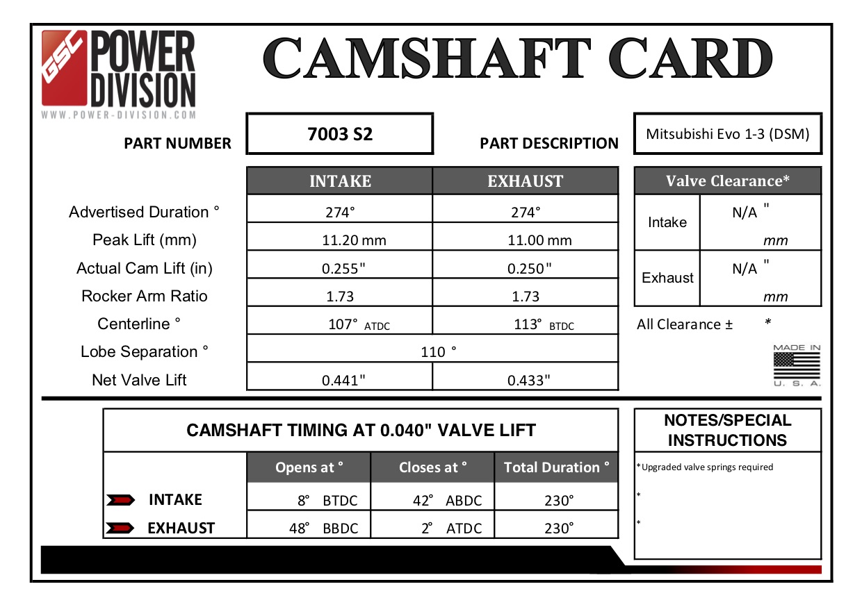 GSC Power-Division billet S2 cams for the Mitsubishi Evo 1-3 and first and second Gen DSM cars. The S2 cams are designed for those with more power in mind or a larger turbo. No low end power is lost vs. the stock cams when used with the larger turbos. The S2 cams will show gains of 50-70whp over the stock cams, and in some cases more in the higher RPMs. Great for 2.0L engines revving to 9000 RPMs or for stroker motors revving to 8000 RPMs. The S2 cams are suggested to run on our upgraded beehive valve spring replacement or can be run at the stock rev-limit and factory boost on the stock spring.