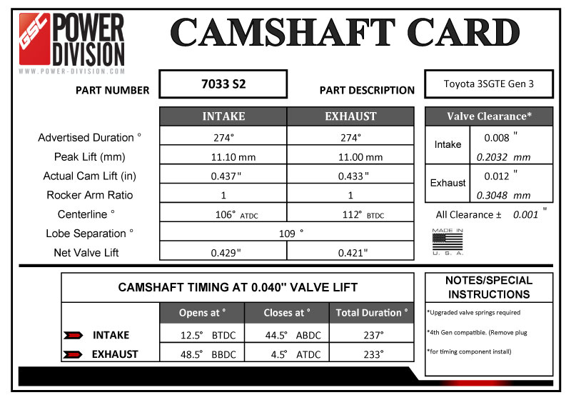 GSC Power-Division billet S2 Cams for the Gen 3 3SGTE MR2 Turbo, with shim under bucket valve train. Designed to support over 850 WHP. This cam is for a serious engine: big turbo, built motor, built/ported head, and engine management. You will notice better spool characteristics, and more horsepower and torque in the mid and top end of the revs.
