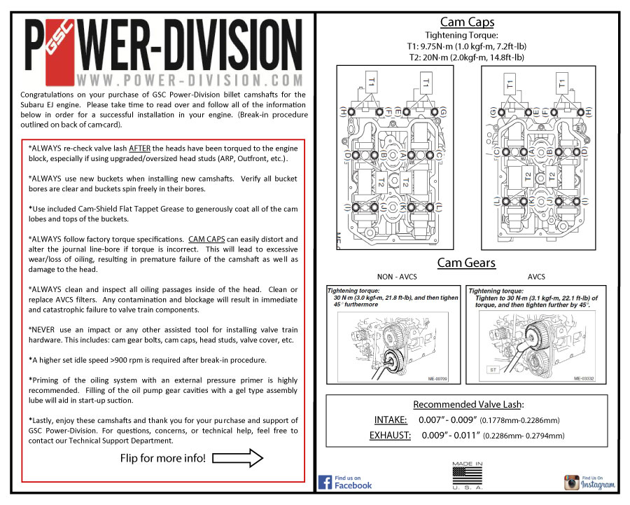 GSC Power-Division Billet S2 camshafts for the Subaru EJ207 version 7 and above with single AVCS. These cams are built to suit higher horsepower engine builds with a power range of 500 WHP and above.  Certain modifications are recommended to utilize the true potential of the S2's including an upgraded engine block, built/ported heads, and dyno engine tuning. Upgraded valve springs are required.  Due to the added lift and duration, cylinder head clearancing may be required.