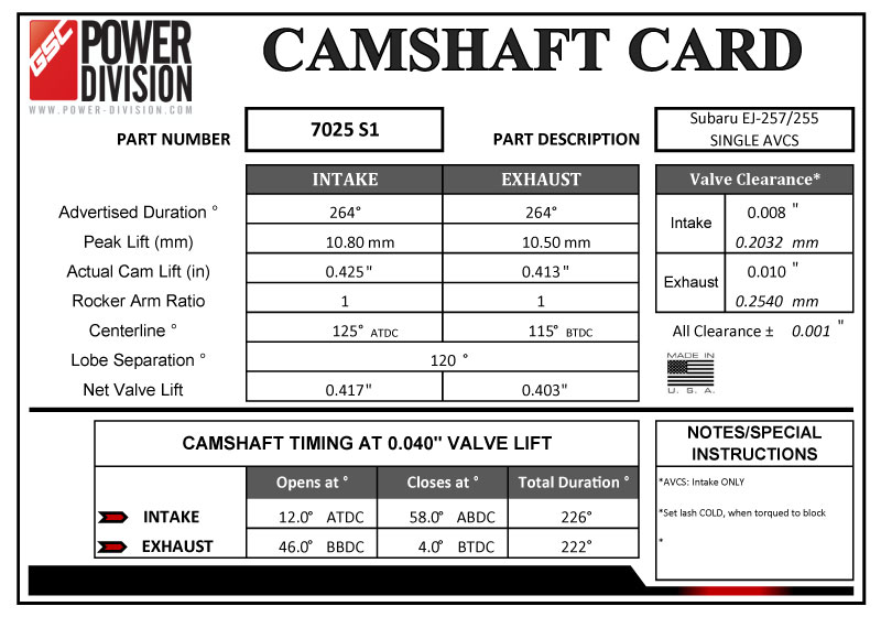 GSC Power-Division billet S1 camshafts for the USDM STi and WRX with Intake only AVCS. These will not drop any low end power, and will create more power and torque across the entire RPM range. Good for stock frame upgraded turbos or up to 500 WHP upgrades. Upgraded valve springs are required; beehive valve springs are recommended, but not required.