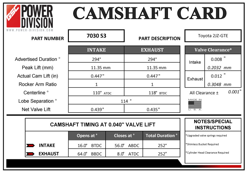 GSC Power-Division's big, nasty billet cams for the 2JZ-GTE! Not for street use. 1,500+ HP applications running anything from Methanol, NO2 or 45+psi on large frame turbos. This is a serious cam for serious horsepower. These camshafts do require a valve spring upgrade capable of handling the added boost and RPM levels of high horsepower engine builds.