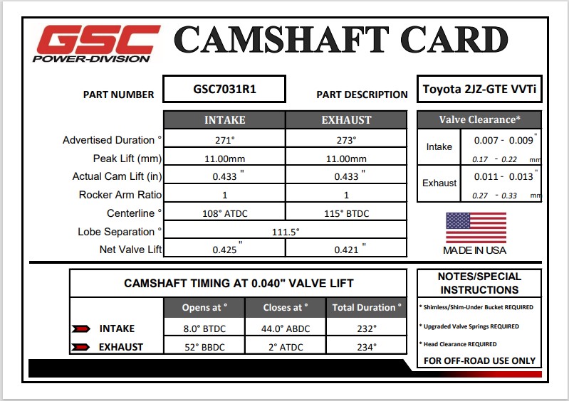 GSC Power-Division Billet R1 cams for the Toyota Supra 2JZ-GTE w/ VVTi.  This profile was designed with the drifter or road racer in mind for fast spool and quick recovery from on off throttle which make them ideal for a street car as well. While the R1 cams were designed for those running Stroker engines and wanting maximum cylinder fill at lower RPM stock displacement stroke engines work just fine on them. Do to the aggressive ramp design of the profile limit revs to 8500 rpms (valve spring dependent). Effective rpm range of 4000-8500 RPMs. These cams require an upgraded valve spring set such as our Conical Spring kits (GSC5064 or GSC5066) along with shimless buckets/tappets and head clearance for lift.