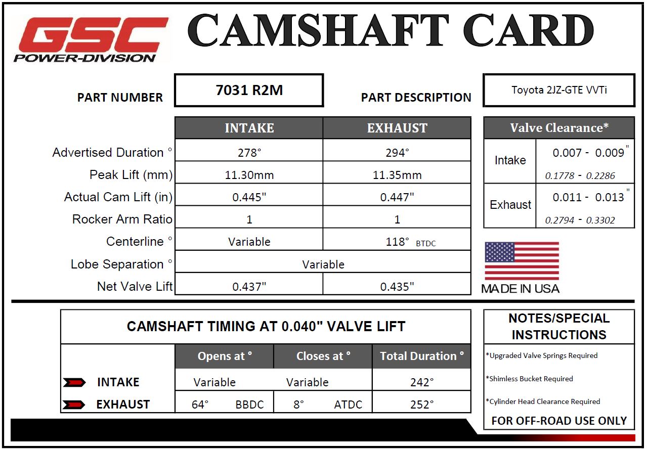 GSC Power-Division Billet R2M cams for the VVTI Toyota Supra 2JZ-GTE. The R2M cams are designed for those running methanol on large single turbos, larger than 80mm.  Designed for a rev range of 5500-10000 RPMs. These cams require an upgraded valve spring set such as our Conical Spring kits (GSC5066 or GSC5086) along with shimless buckets/tappets and head clearancing for lift.